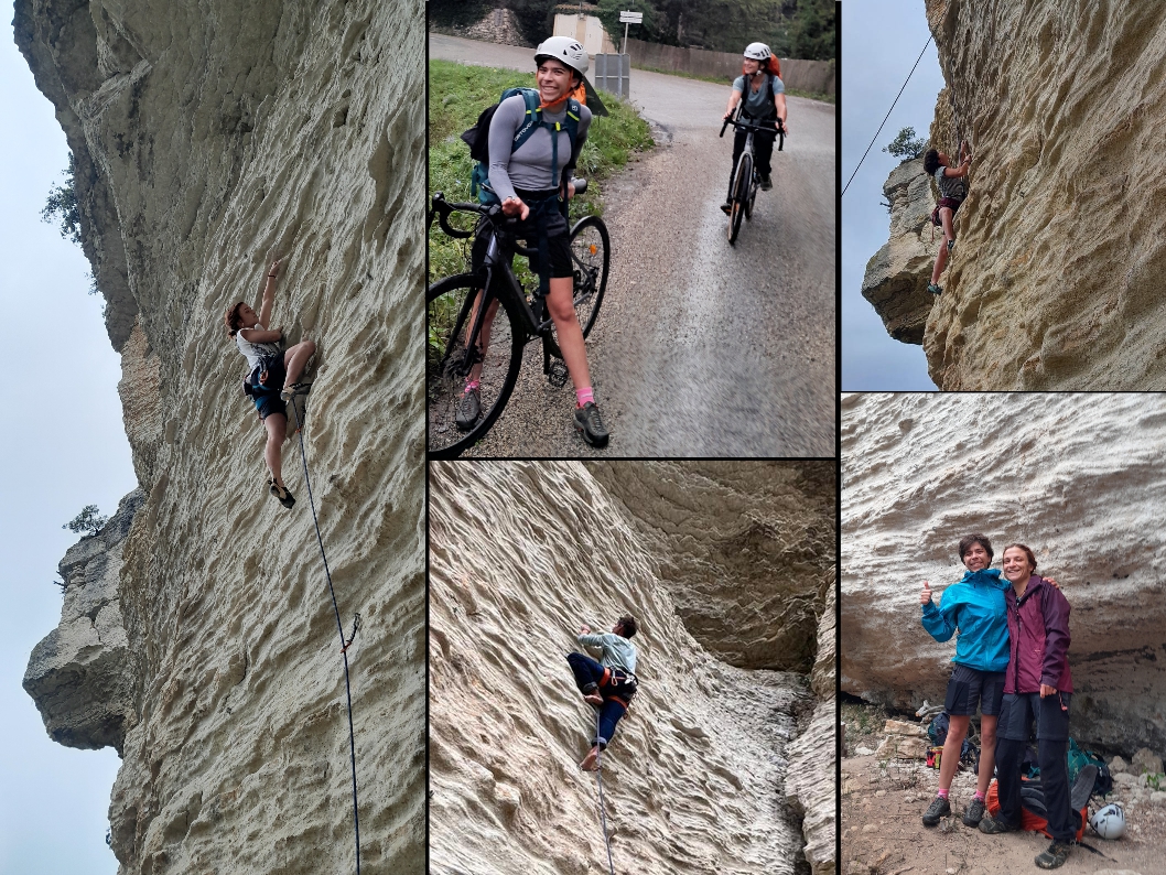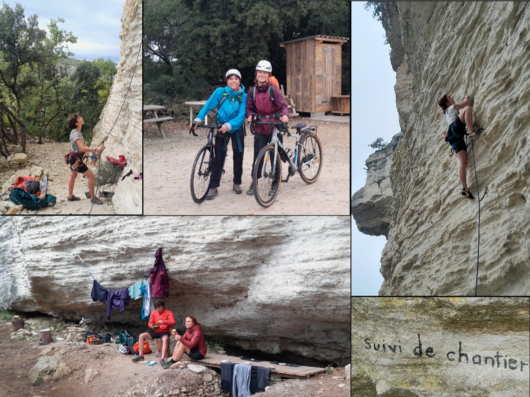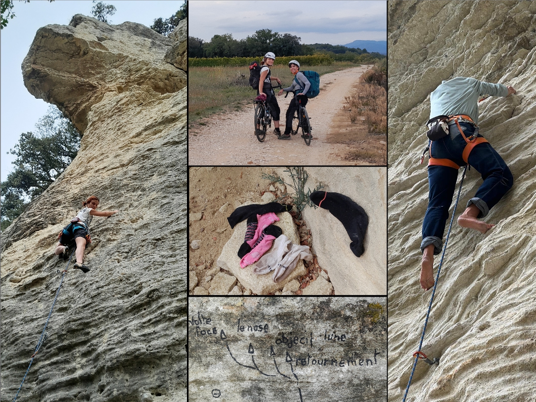 Après une petite heure de pédalage, et 5 minutes de marche d’approche, nous voilà donc arrivées au nouveau secteur de Venasque et c’est « Sous les Espuys », que nous posons notre campement…. entendez par là… où on étend notre linge ! Donc on se change et on met des affaires sèches, puis on fait une petite visite du site, pour repérer les voies abritées qui nous permettront ensuite de grimper au sec !