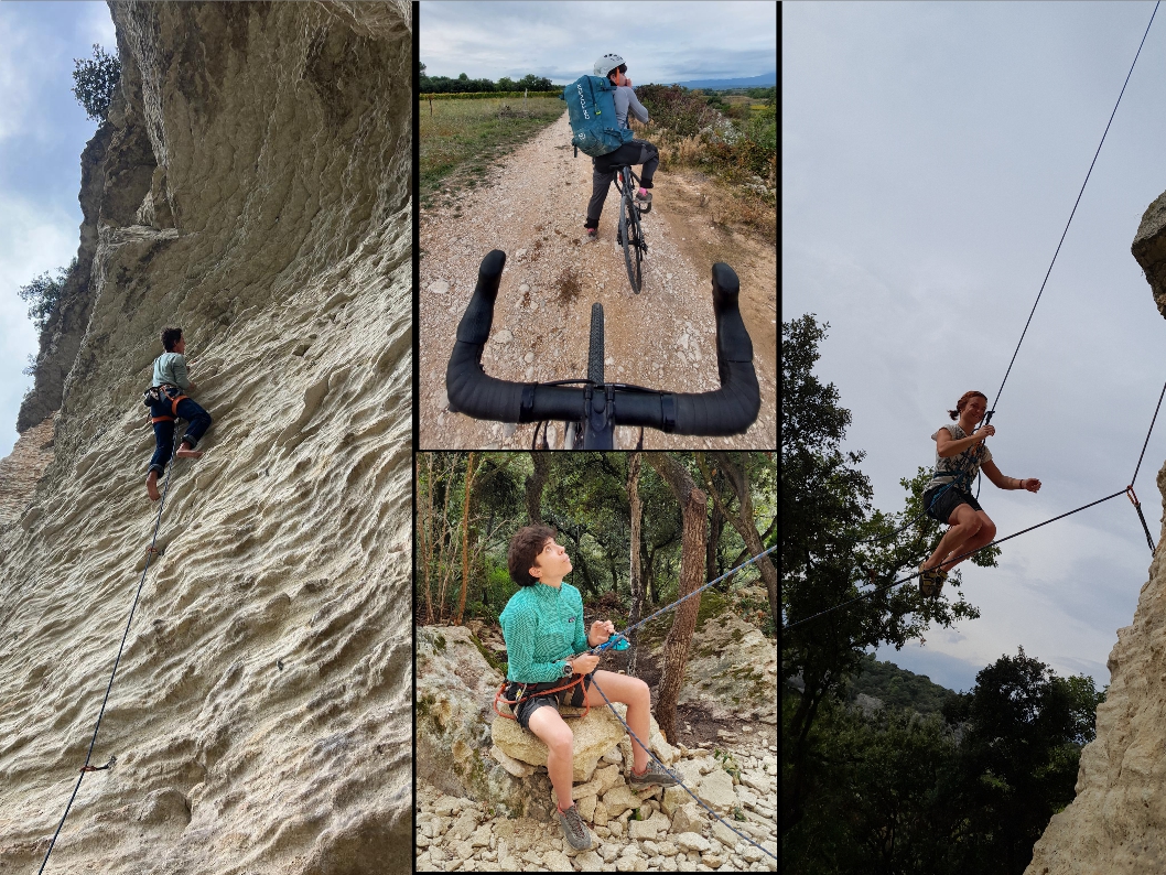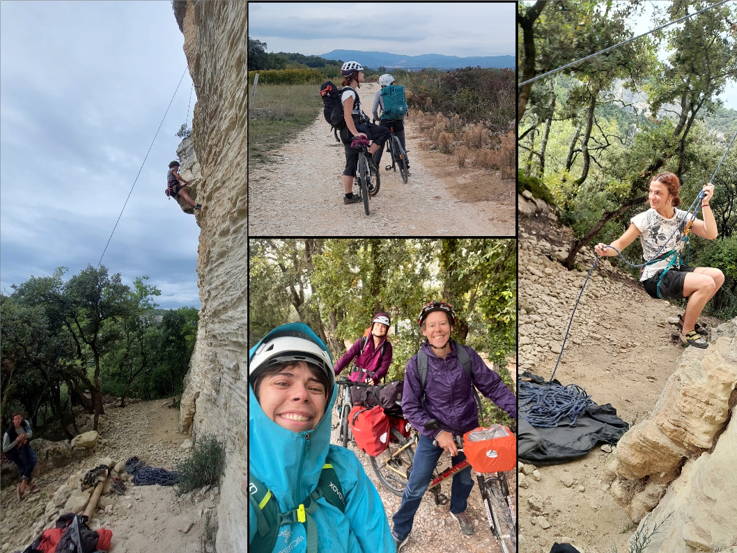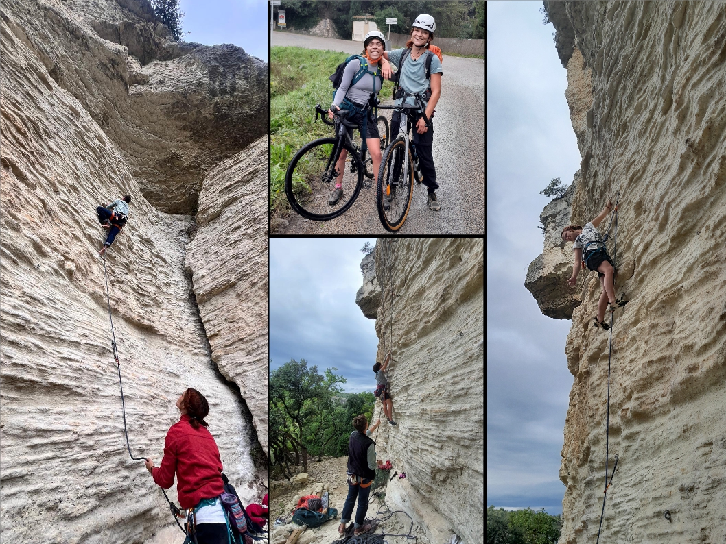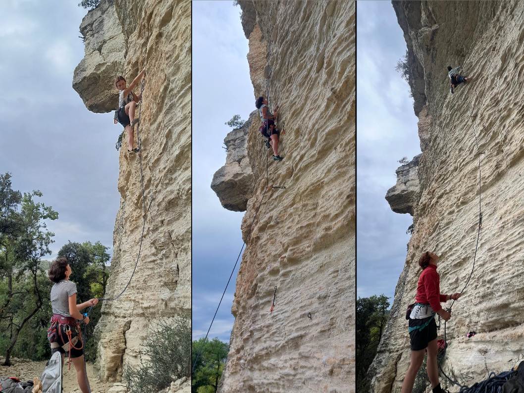Après un bon petit pique-nique, direction les 6a du « Perchoir » pour digérer. 3 6a plus tard, on se lance dans « suivi de chantier » 6b+ puis, « Objectif lune » 6b+ aussi ! Après avoir découvert les joies des bras « daubés », grâce aux jolies voies déversantes de Venasque, le temps a filé et on se rapproche de 17h… il va être temps de plier… car on doit encore pédaler !