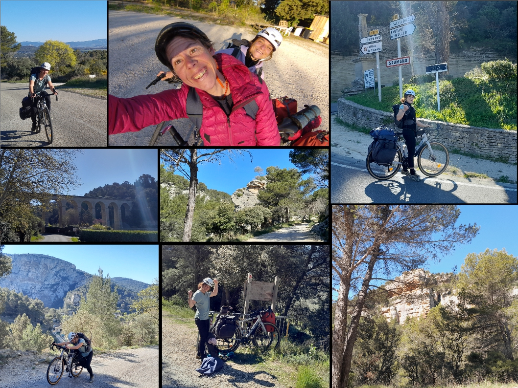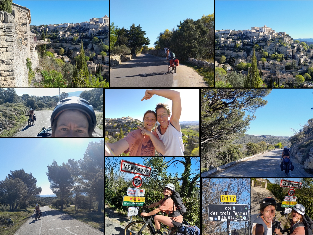 Cette fois, on met le réveil car on a donné rdv aux copains vers midi à Venasque ! On a donc un timing à tenir ! Réveil à 7h donc, en vue d’avoir le temps de ranger notre mini campement, de remettre toutes nos affaires dans les sacoches, puis démontage et pliage de la tente ! On est prête à décoller à 9h pétante, direction Venasque par la route de Gordes et la combe de Sénanque !