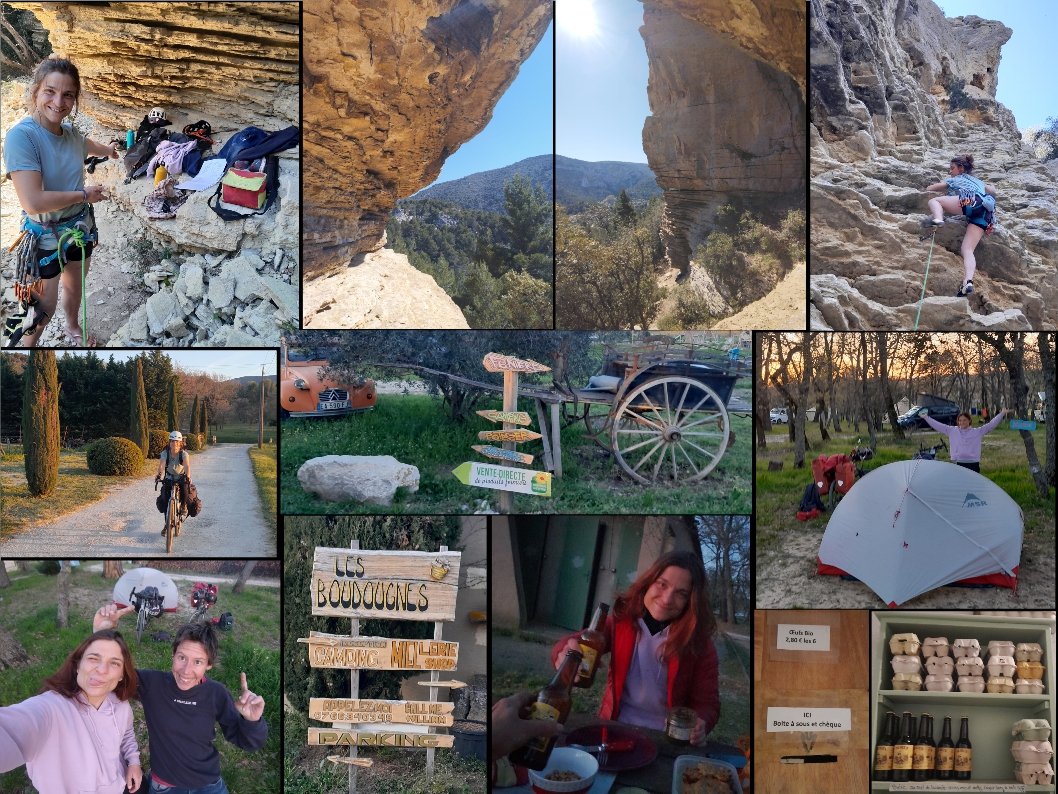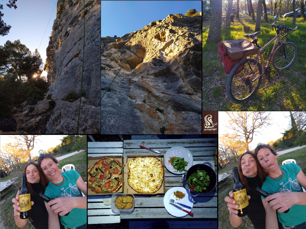 La montée est un peu plus longue & plus raide que par Saumane et c’est un peu dur pour nos cuisses et nos mollets ! Mais après cette « bavante », on arrive enfin au col des 3 Thermes vers 11h ! Petite pause avant de profiter de la jolie descente jusqu’à Venasque (où ça remonte légèrement) avant de redescendre et d’arriver au secteur « Sous les Espuys » vers 11h40 ! Heureusement que nous sommes en vélo, le parking est plein ! Tous les parkings sont pleins ! On hallucine sur le monde qu’il y a ici… après 2 jours de tranquillité, c’est un peu le choc ! Bref, le temps de décharger les vélos et d’accéder au secteur pour retrouver les copains, il est presque midi ! L’heure pour nous de dévorer les restes de nos pizzas car avec Olivia, on a FAIM !!!