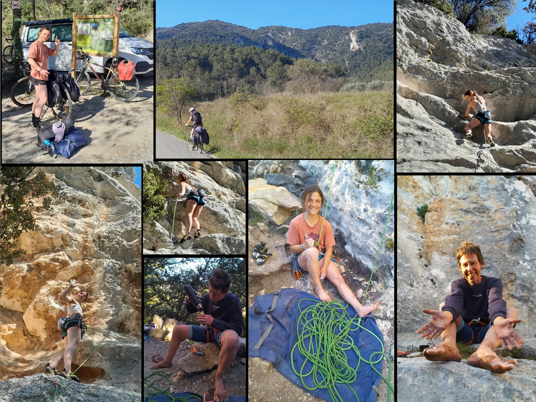 On décolle vers 9h45 du camping, direction la jolie falaise d’Oppède, où l’on arrive vers 10h15, après 5 petits km de légère montée ! Le temps d’accrocher les vélos et de faire la petite marche d’approche, nous sommes au pied des voies vers 10h30 !