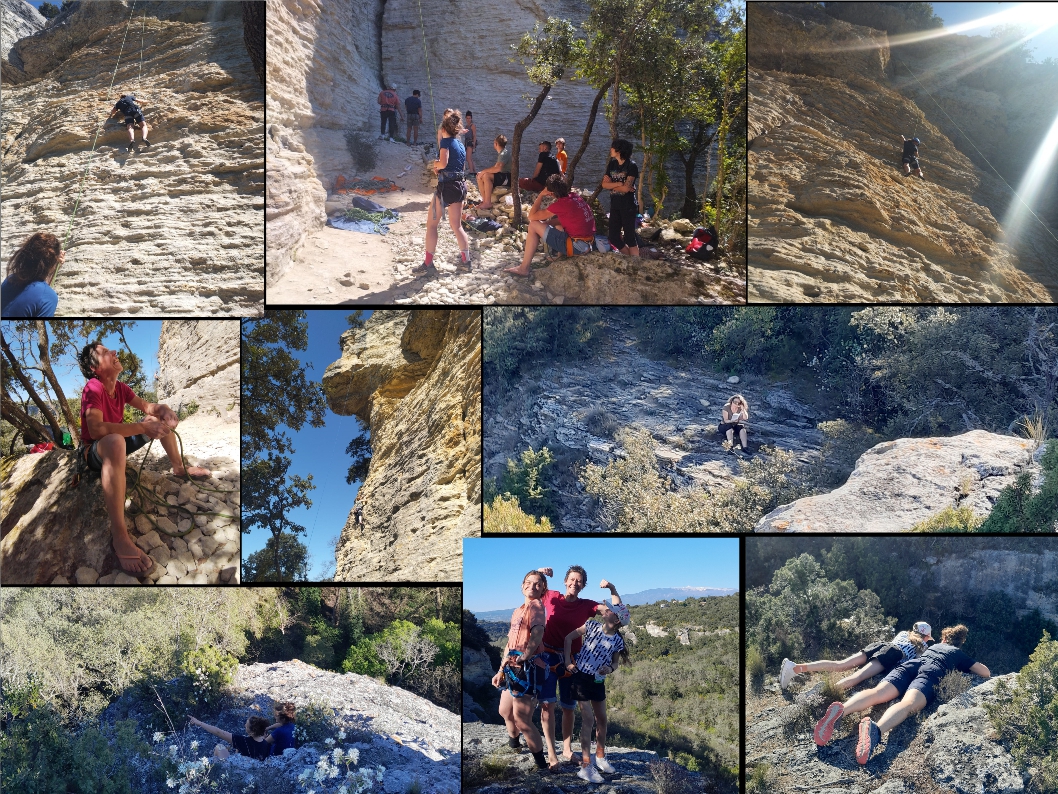 Il y a déjà Jeanne, Floriane, Néhamat, Stéphanie et Niels à la falaise ! Ainsi que plein d’autres grimpeurs !!! Flavien nous rejoint ensuite, ainsi que Constance et Emilou qui sont venues en vélo elles aussi !